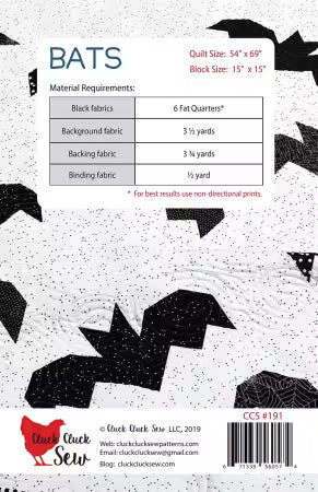 Throw size 54" x 69", uses only 6 fat quarters for the bats and simple, traditional piecing techniques.